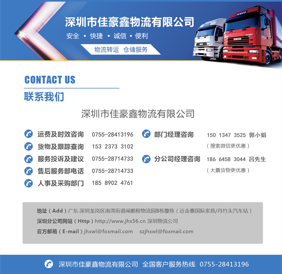 投訴建議大票貨物聯(lián)系人:呂太濱 186 6458 3044 (分公司負(fù)責(zé)人) 投訴郵箱:szjhxwl@foxmail.com QQ:2425174659
